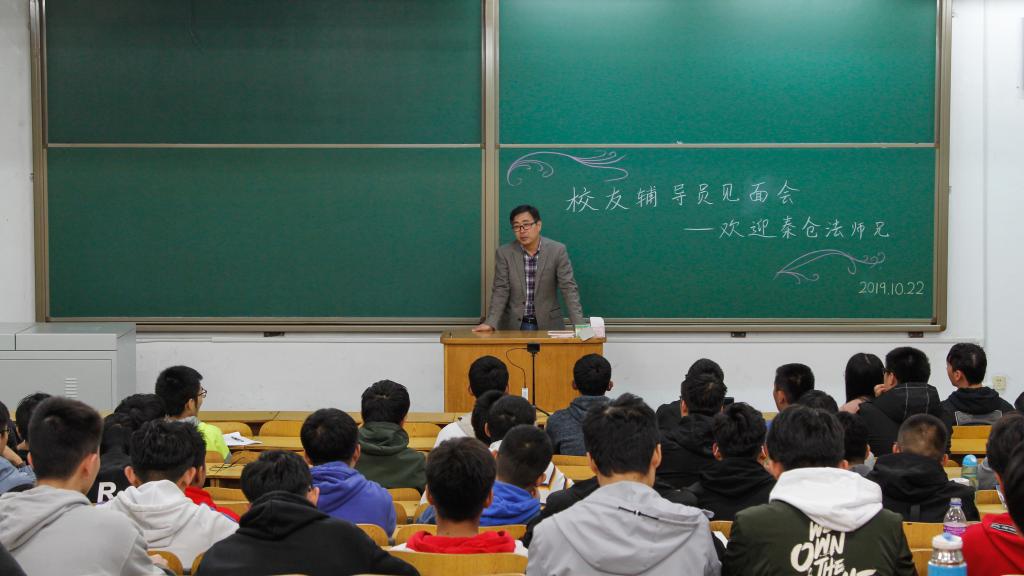 秦师兄一到,同学们便以热烈的掌声欢迎他的到来。他与同学们一同回忆了第一次见面会的情景。短暂的回忆过后,他讲述了自己的求学与创业经历,以自己的从业经历告诉我们无论如何都要相信自己的专业知识,并以此引出2018级学生重视的专业分流的问题。