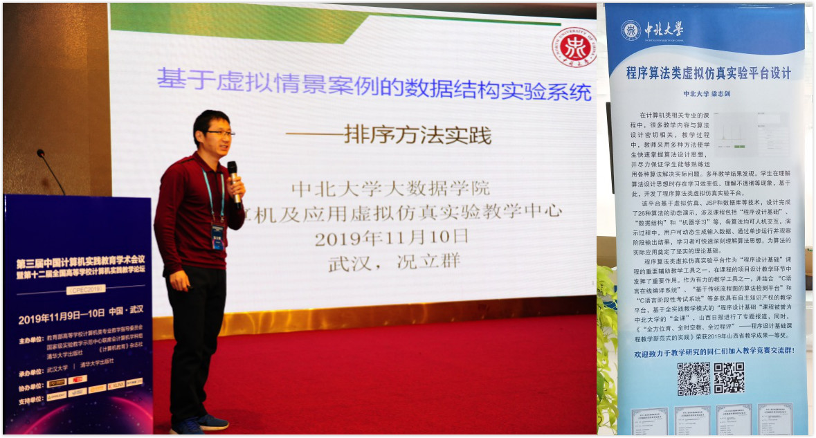 教师张元、况立群和韩燮研发的虚拟仿真实验项目《基于虚拟情景案例的数据结构实验系统——排序方法实践》获得第四届全国计算机类课程实验教学案例设计大赛一等奖。本赛事由教育部计算机类专业教指委和国家级实验教学示范中心联席会计算机学科组共同主办,旨在推进探究性、创新性实验教学改革,提升高校教师的实验教学水平,促进先进实验教学理念、内容、技术和方法的广泛应用与共享。来自全国各大高校的近30家国家级计算机实验教学示范中心参与了本届赛事,提交了70项实验案例,最终通过先网评后会评的方式评出奖项。计算机及应用虚拟仿真实验教学中心副主任况立群受邀做了专题报告,介绍了实验中心的平台建设情况,获奖实验案例的改革思路、建设内容和实施方法,并从专业人才培养角度对实验案例在策划、实施、评价的实践经验进行了分享。