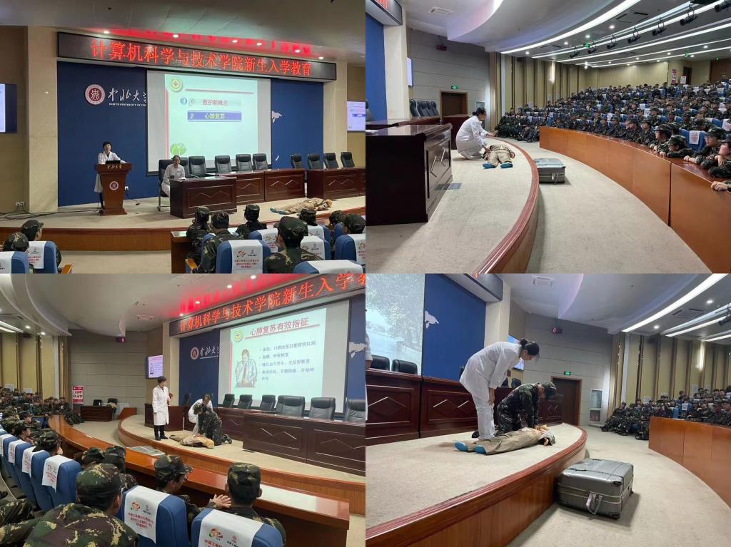 第二场讲座由校医院的张主任主讲,主题为急救知识与技能培训。张主任用通俗易懂的语言,向同学们详细讲解了气道异物、溺水、心肺复苏术等急救理论与施救技巧,指导学生把握“黄金时间”进行有效的应急救护。刘护士为同学们演示了心肺复苏的操作步骤,并邀请同学上台做实操训练,让新生直观感受和掌握急救要领。