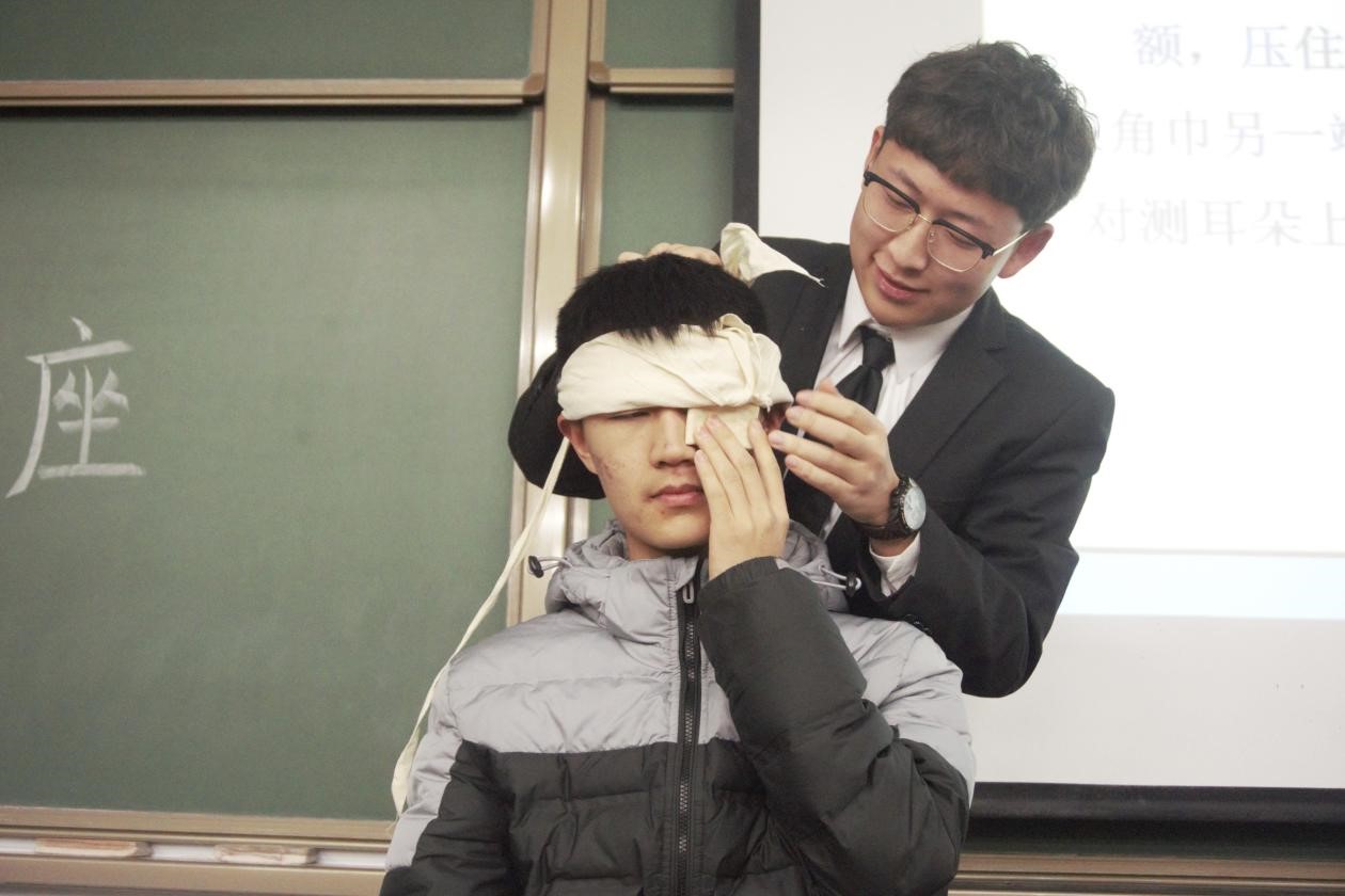 首先,第一位中北安全员王怡淏同学为同学们耐心的讲述了包扎、骨折固定方面的应急救援知识,从生理原理、到伤口成因、再到具体包扎步骤,让同学们从根本出发了解受伤原因,进而通过视频给出每一种伤口具体的急救方法。在讲座现场,王怡淏同学进行了现场包扎示范,带动了同学们学习安全急救知识的积极性,给同学们直观的急救感受。